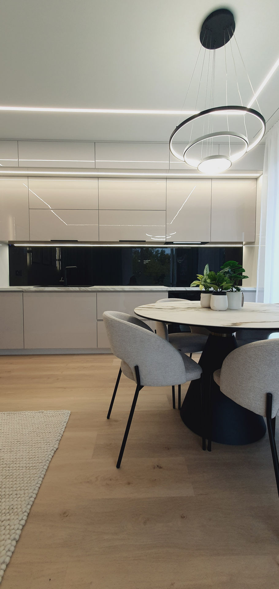 Aneks kuchenny z uwagi na to, że znajduje się w salonie miał mieć charakter bardziej salonowy. Stąd lakierowane na wysoki połysk fronty i blat nawiązujący do marmuru na stole i stoliku kawowym. Choć blat kuchenny to laminat, a blat stołu to spiek kwarcowy.