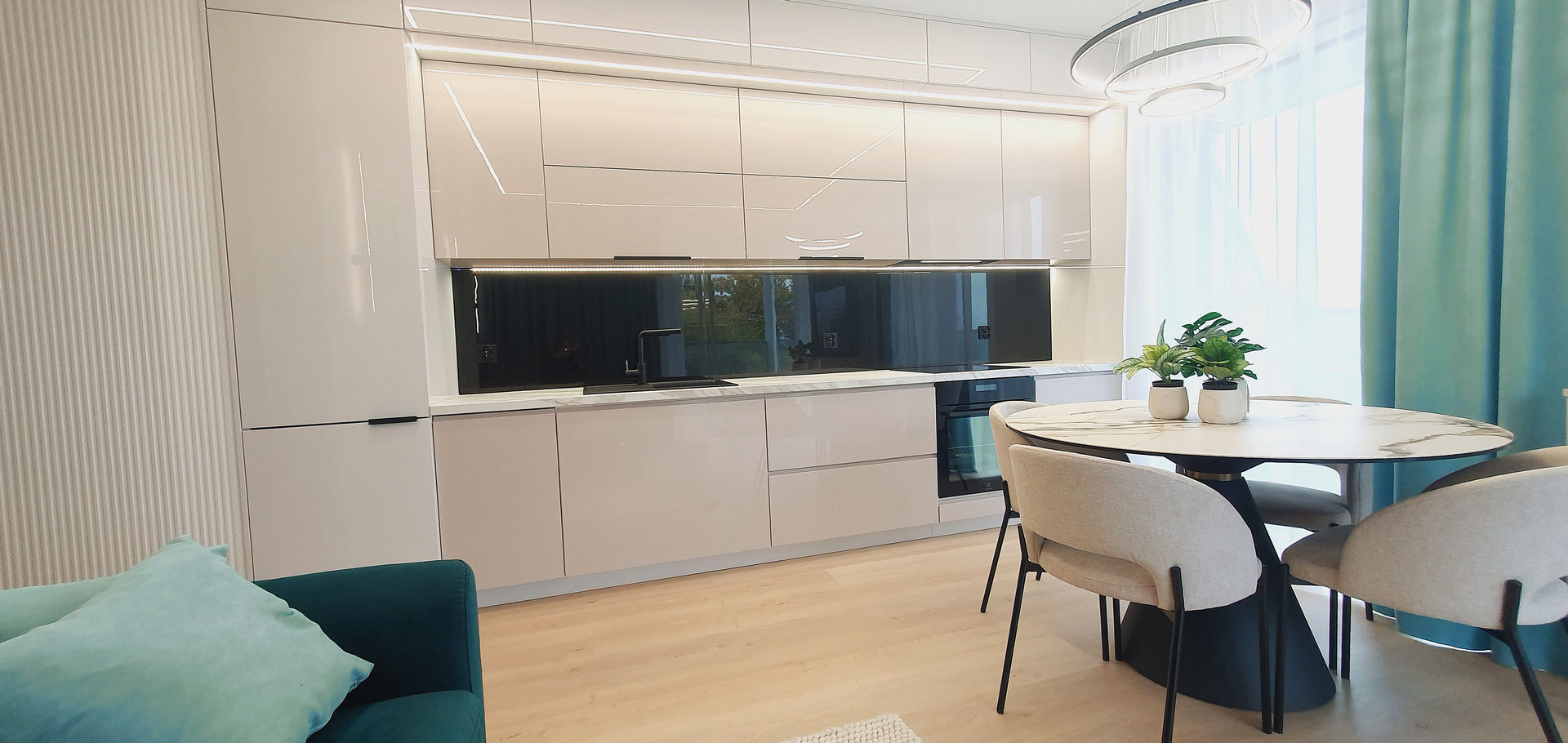 Takie usytuowanie nie tylko zapewnia piękne widoki, ale też miało wpływ na wybór kolorystyki mieszkania. Klienci bardzo lubią odcienie zieleni – zwłaszcza zieleni butelkowej, więc połączyłam ten odcień ze spokojnymi kolorami piasku. Ściany i zabudowa kuchenna ma odcienie beżu, podłoga to panele winylowe o chłodnym odcieniu jasnego drewna.