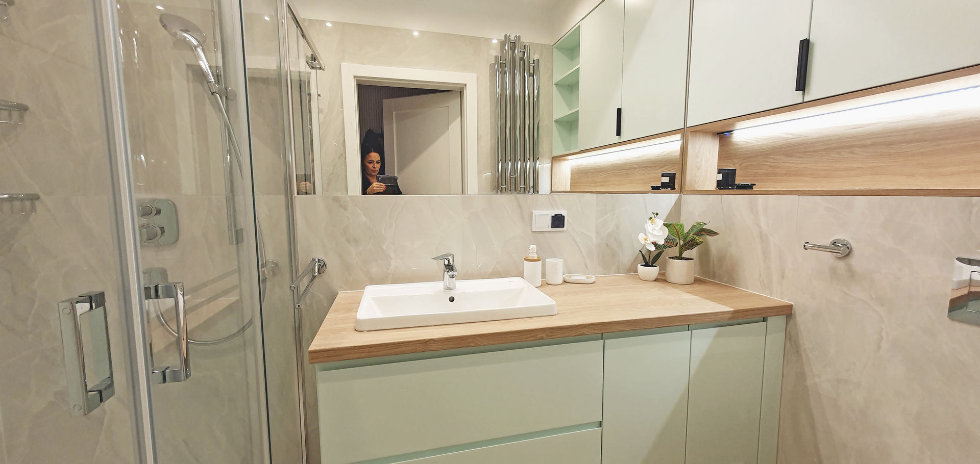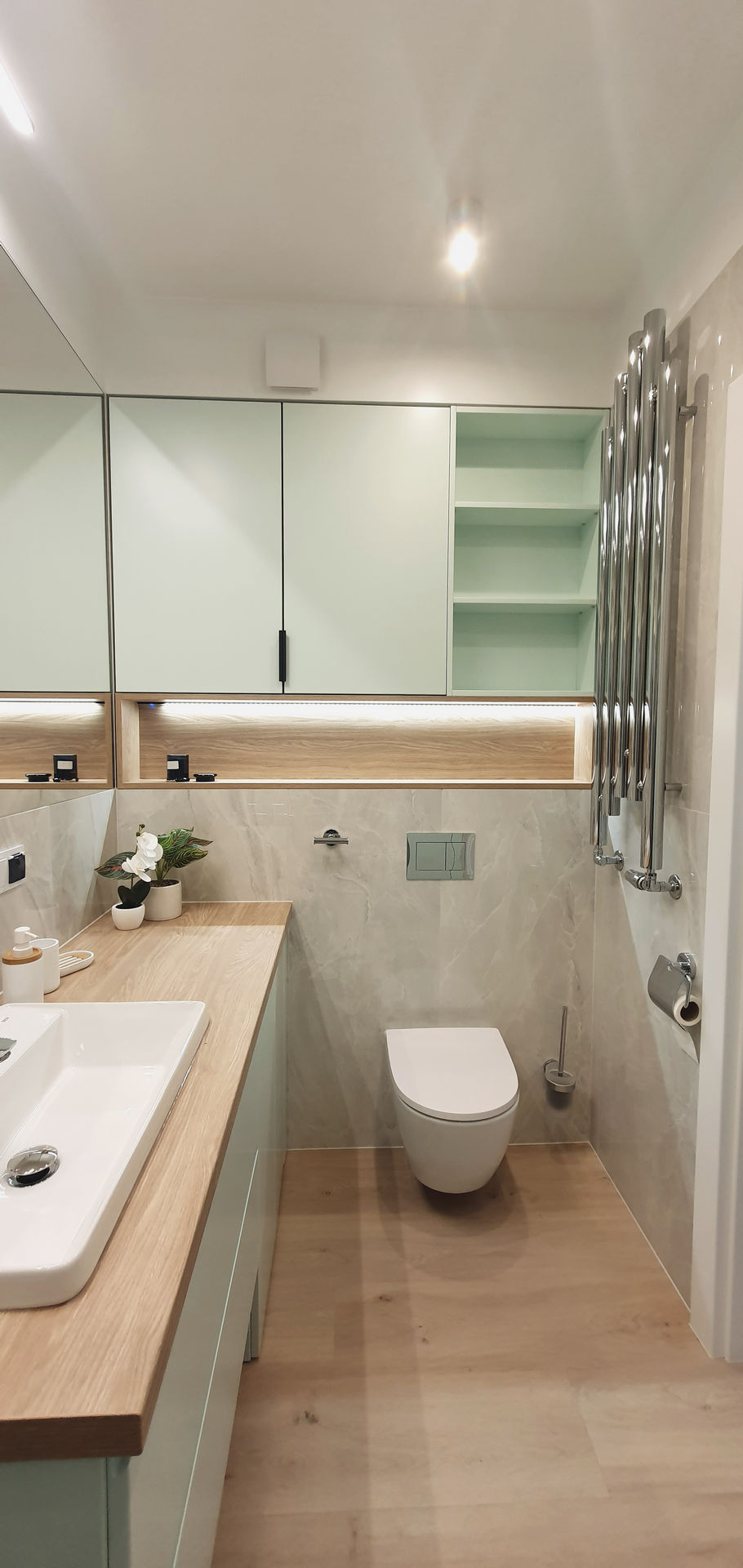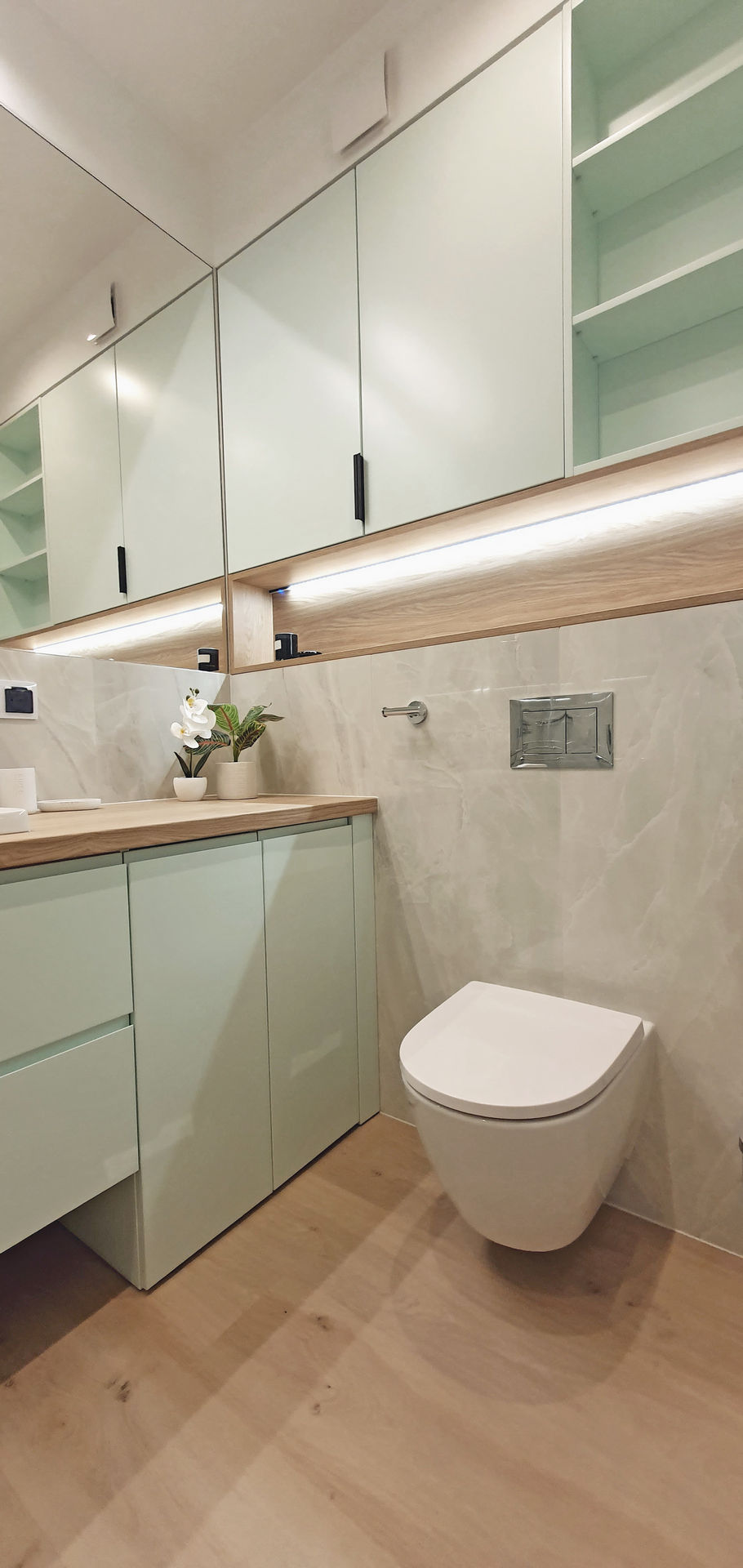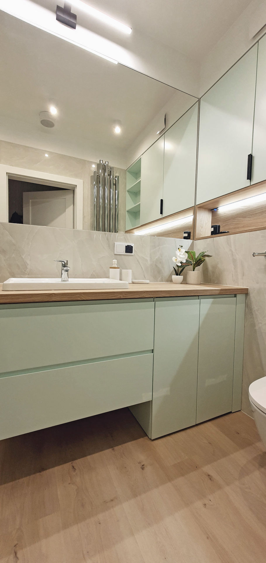 Łazienka z szafkami w kolorze mięty, ukryta pralka pod blatem