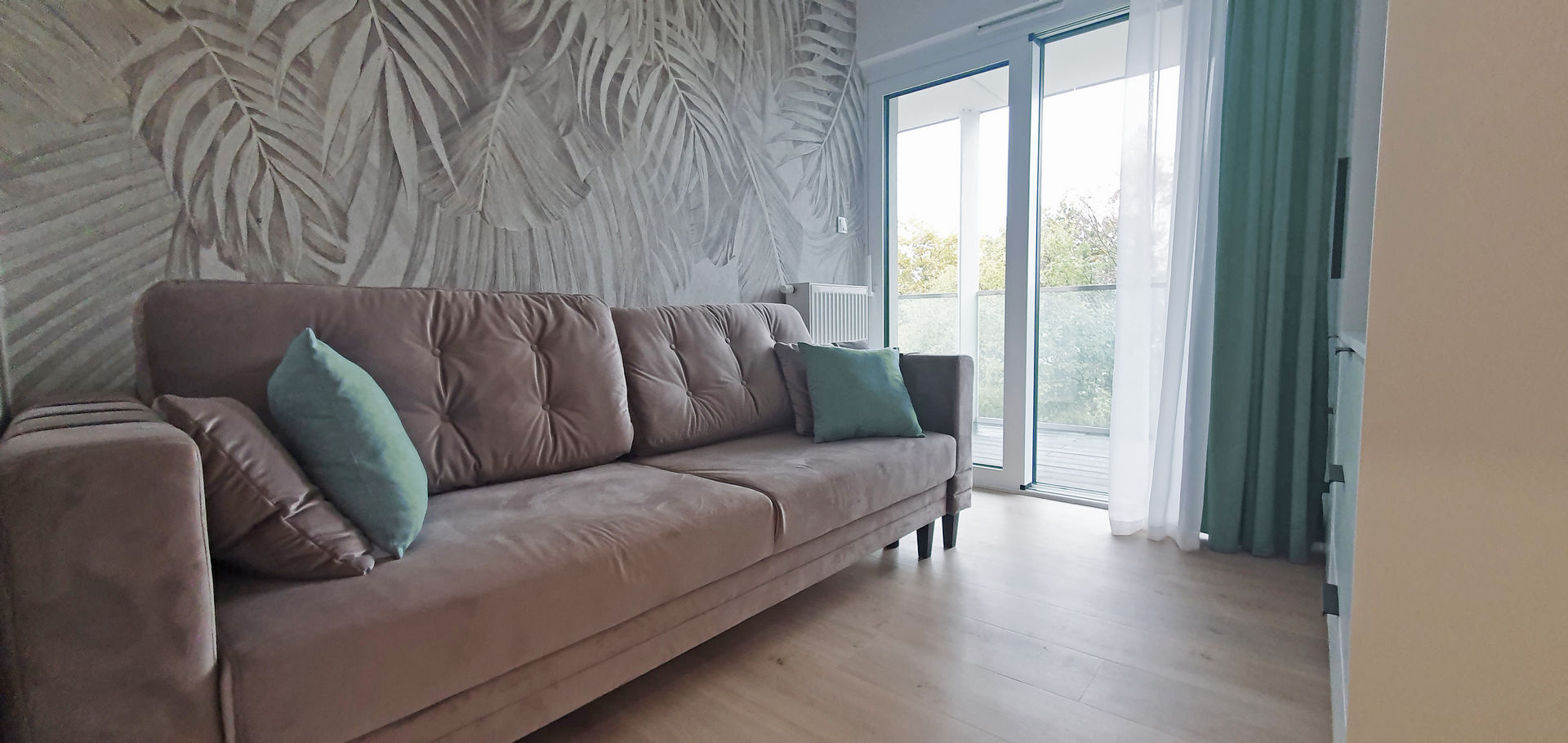 Pokój gościnny z widokiem na morze, welurowa sofa rozkładana w odcieniach beżu