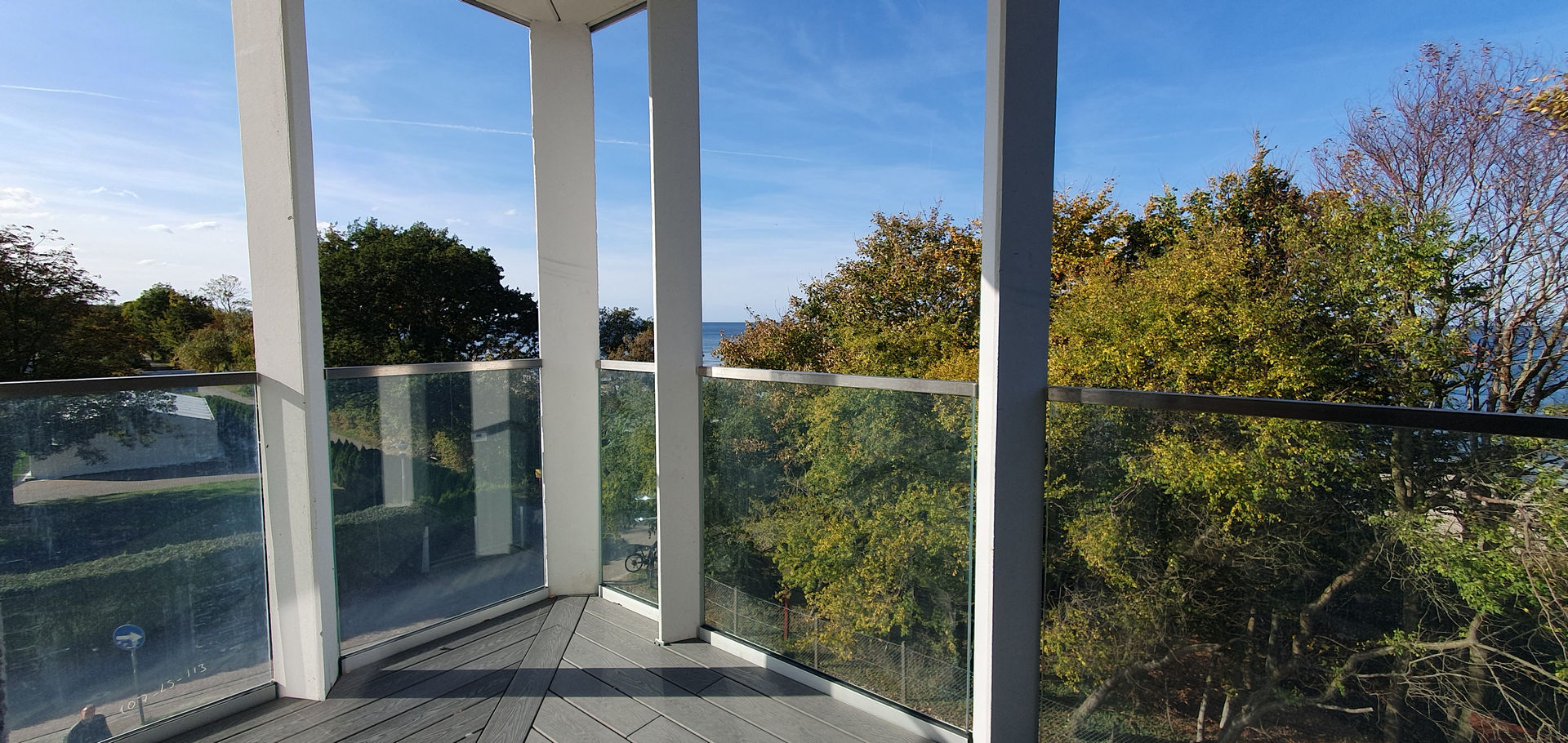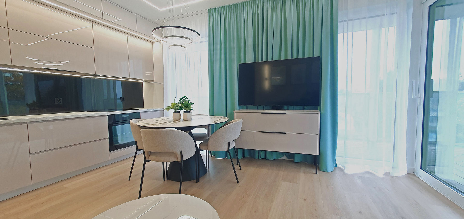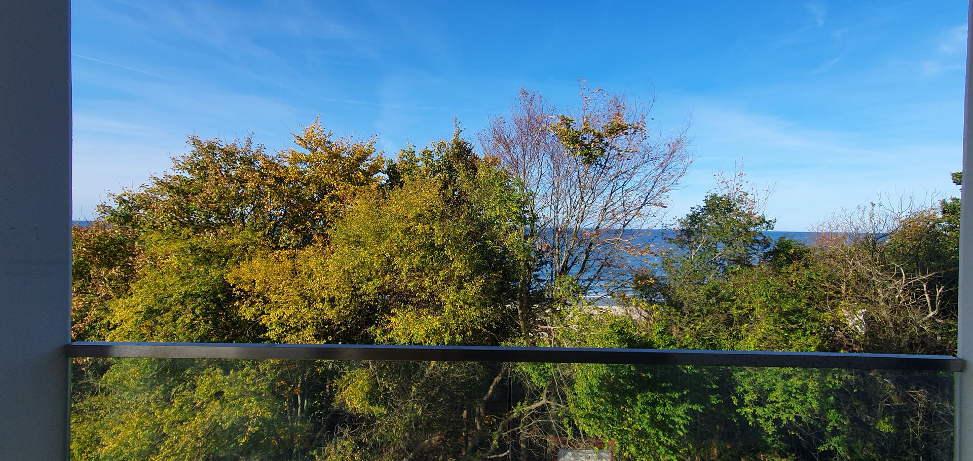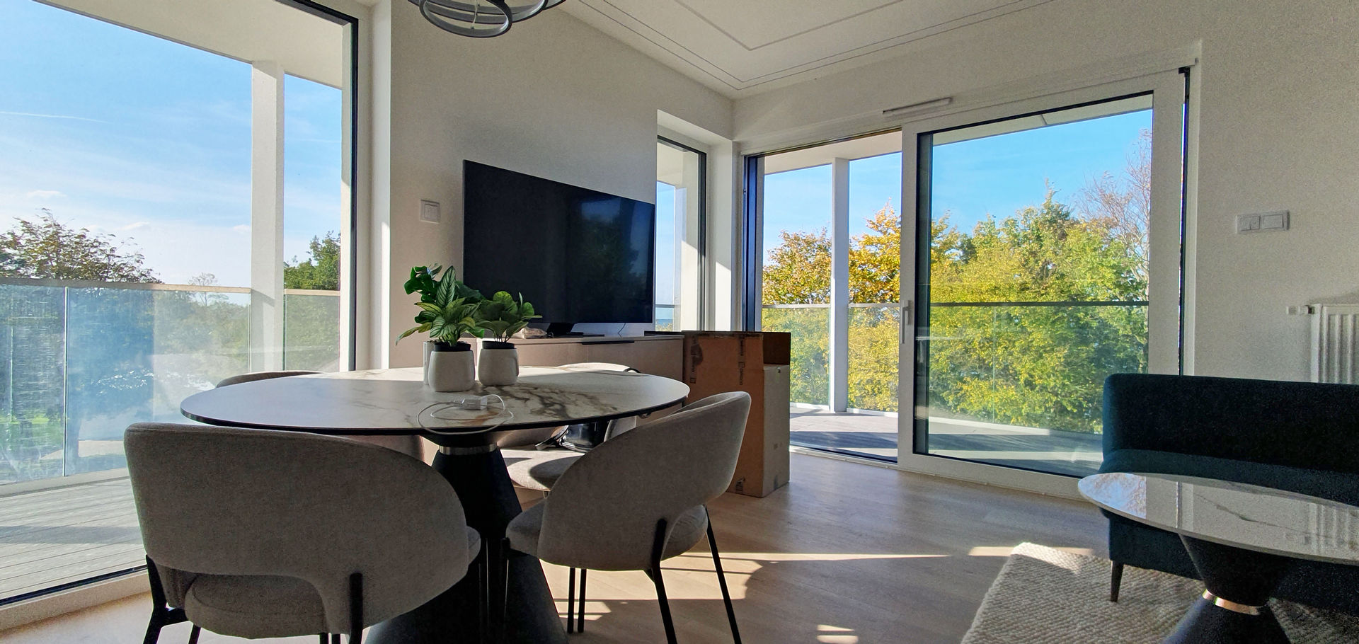 Pokój gościnny z widokiem na morze, szafy z akrylowymi frontami