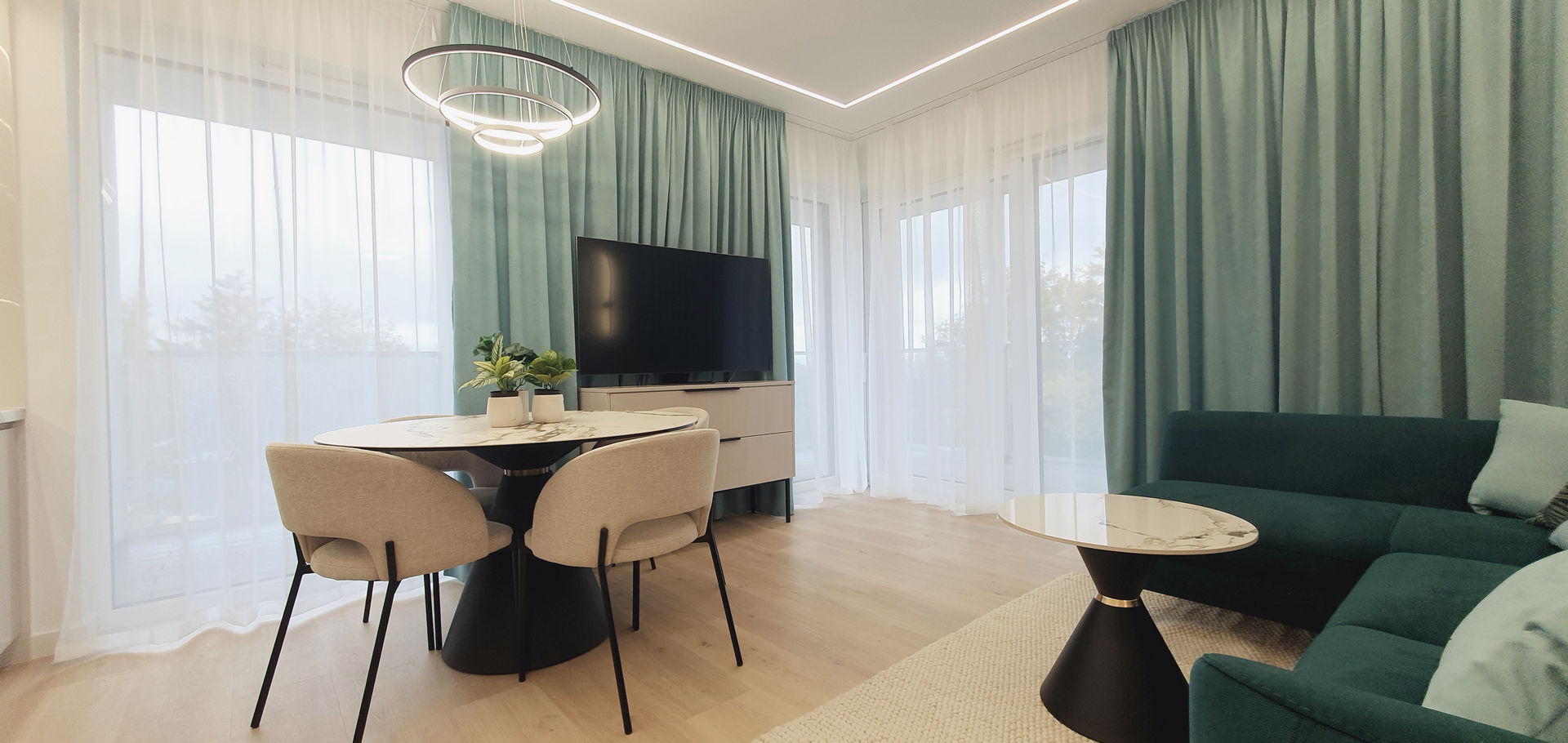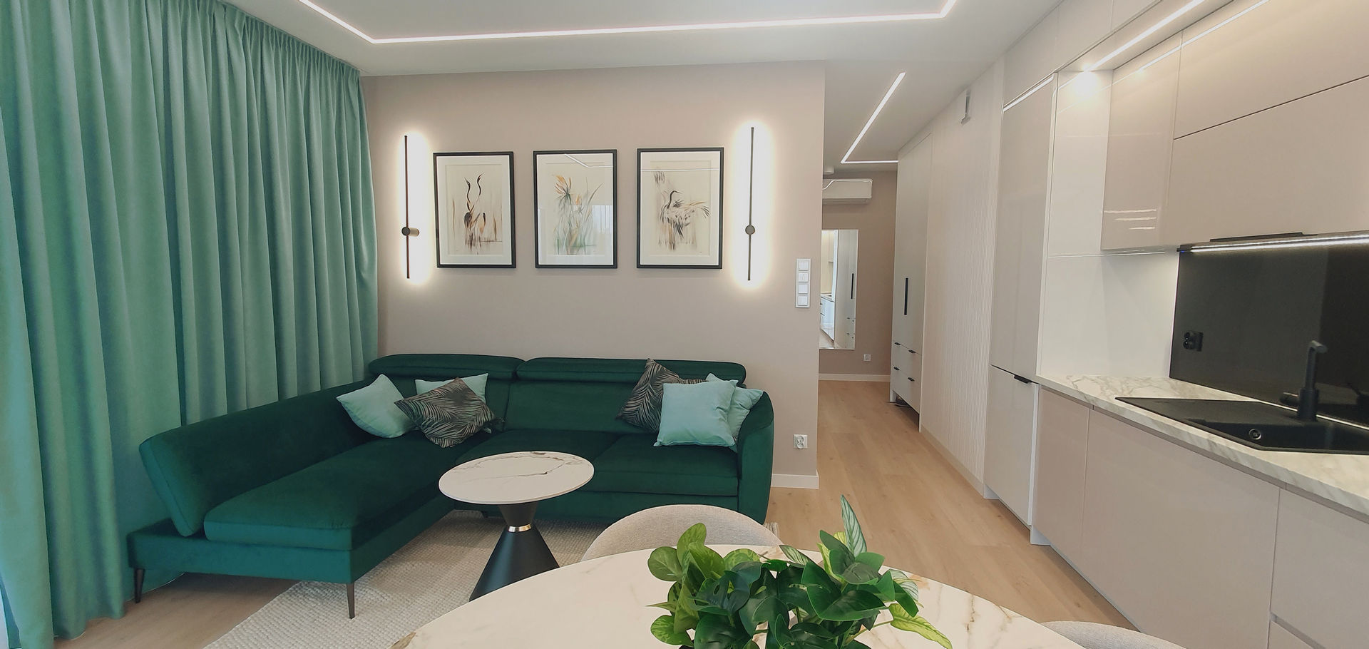 Salon z narożnikiem w butelkowej zieleni, stół z marmurowym blatem