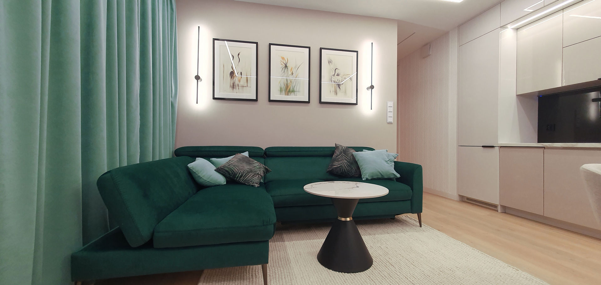 Piękny narożnik w butelkowej zieleni, artystyczne grafiki, kinkiety pin