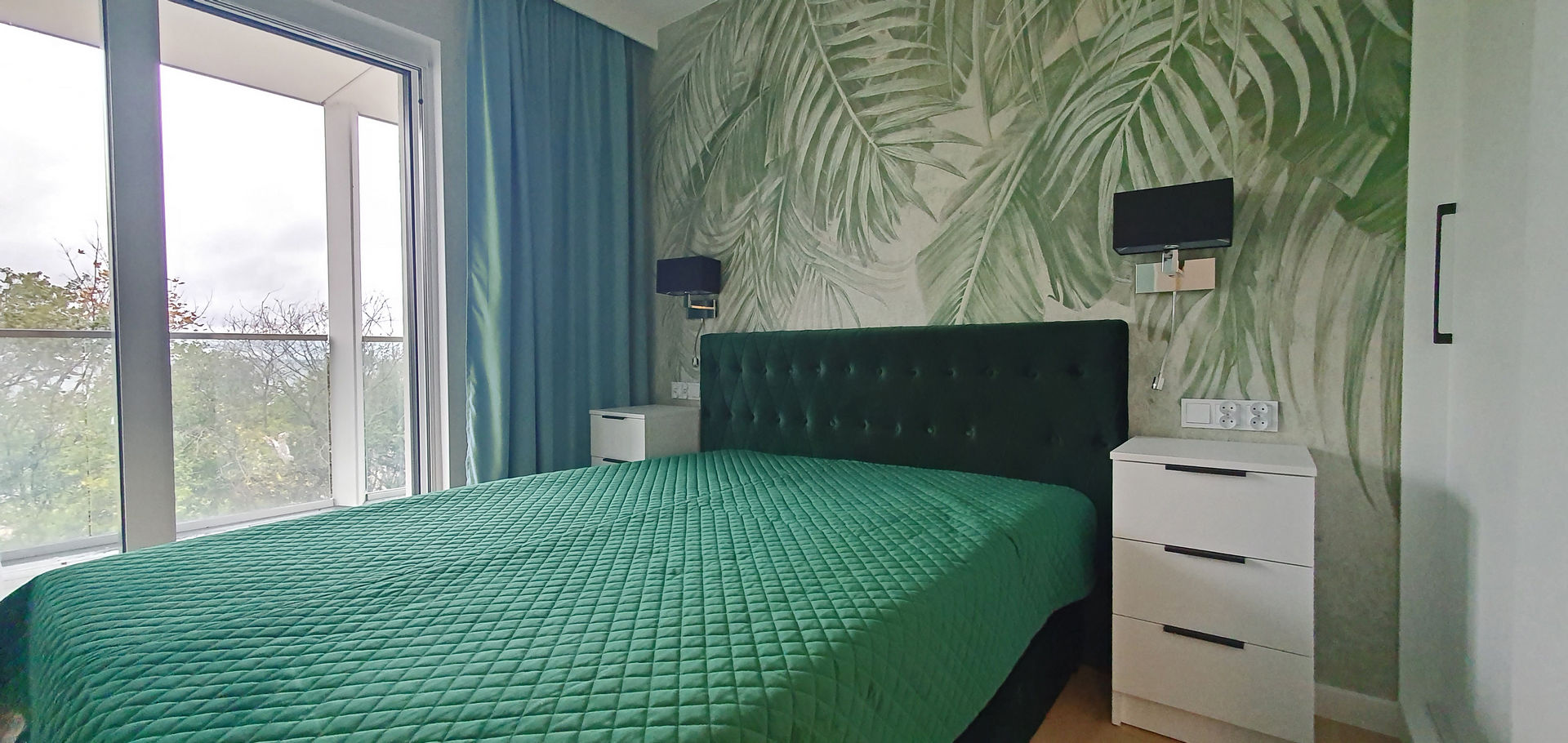 Sypialnia w butelkowej zieleni z tapetą w liście palmy