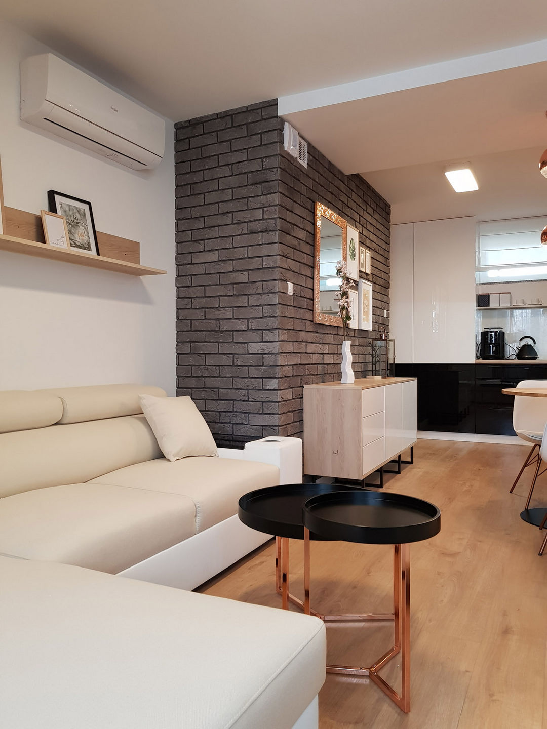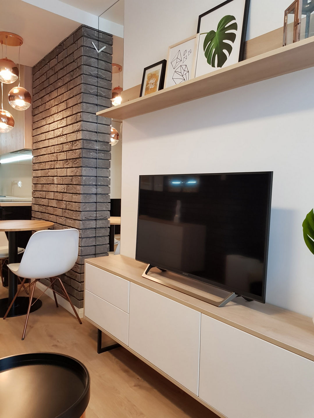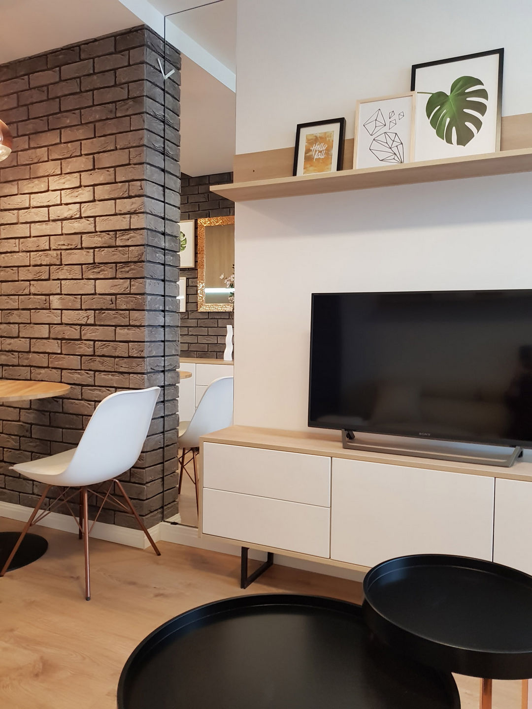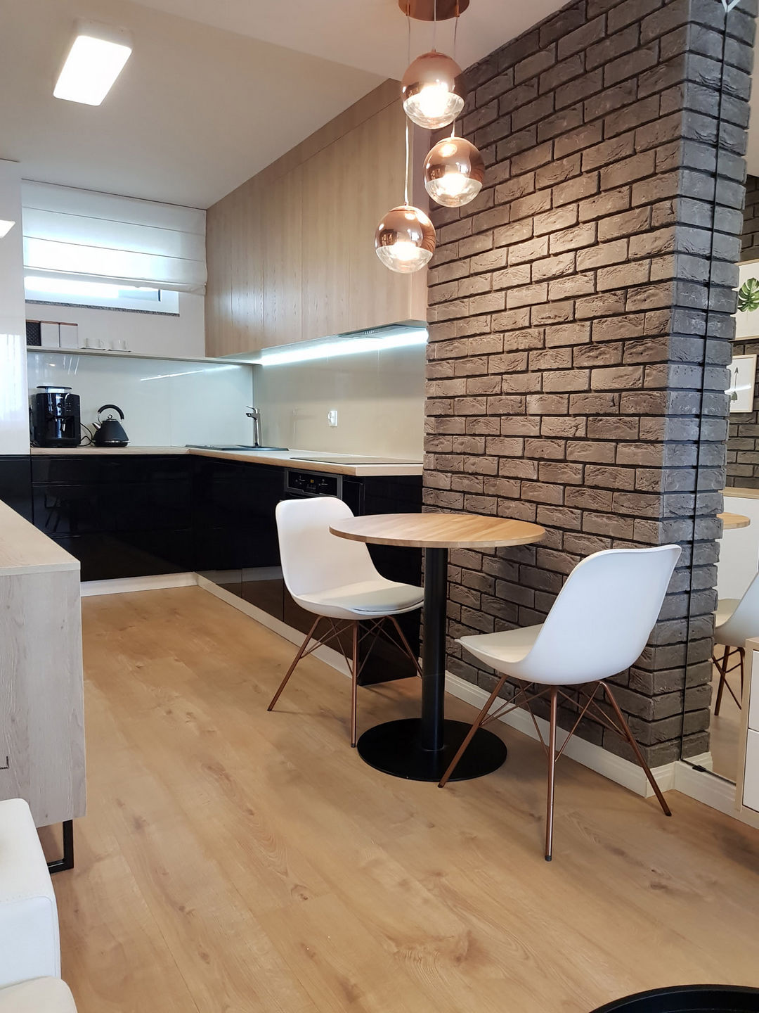 Całość została utrzymana w nowoczesnej stylistyce, gdzie dominuje czerń i biel oraz ciepło drewna.