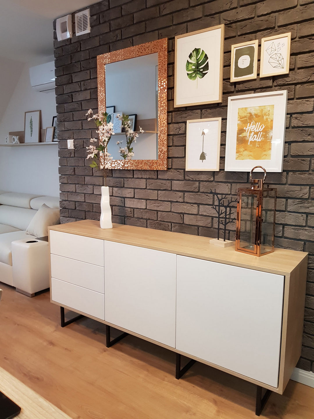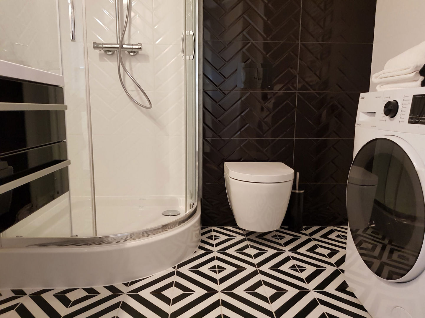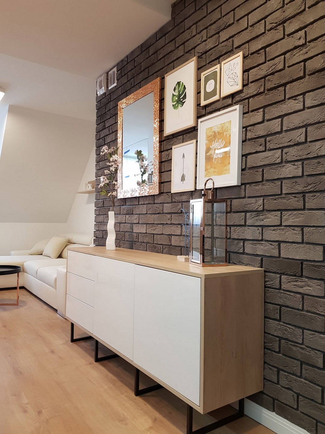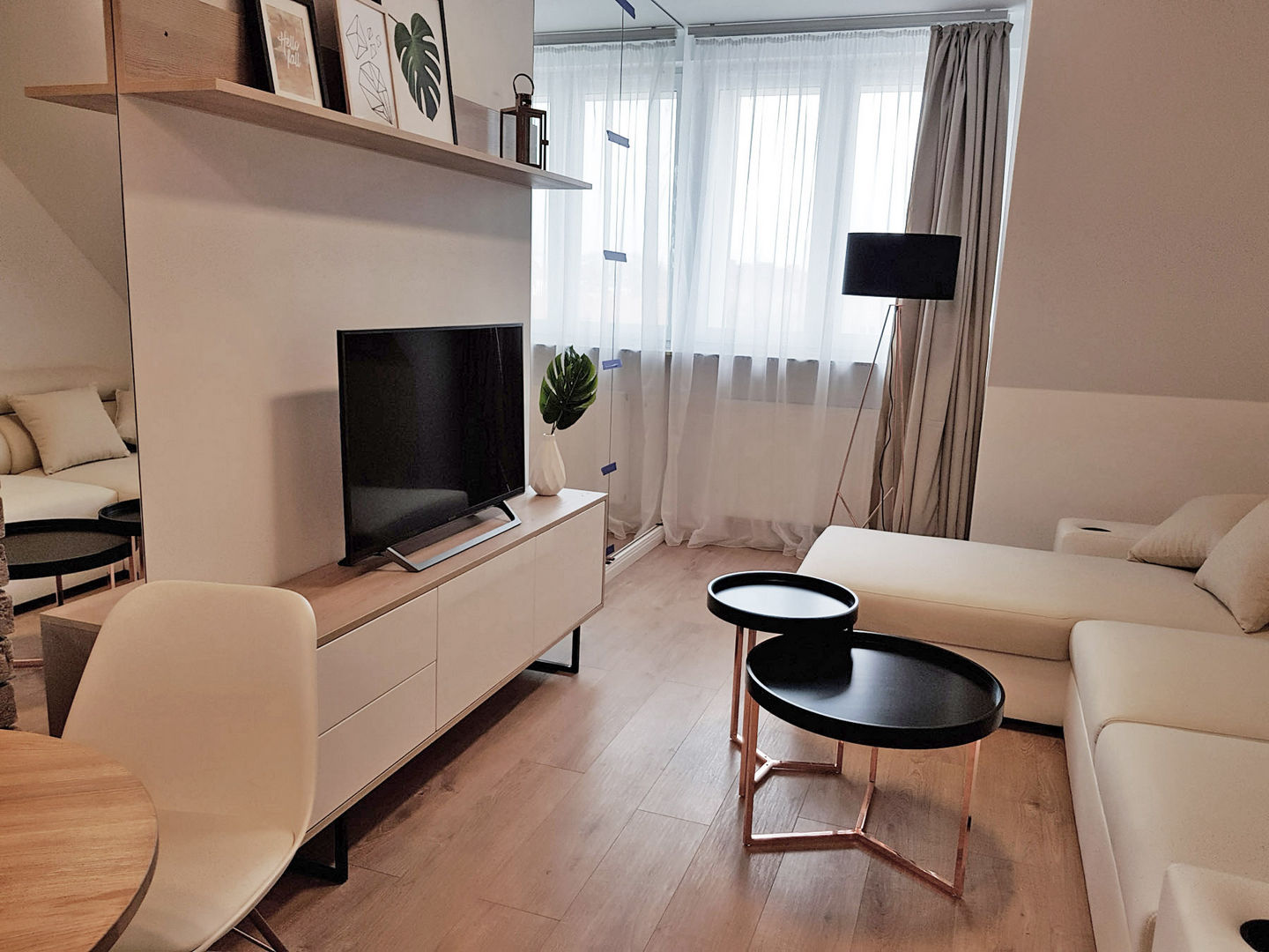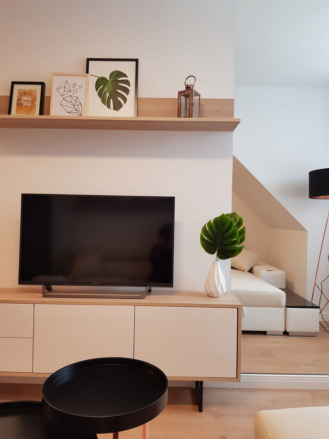 Całość została utrzymana w nowoczesnej stylistyce, gdzie dominuje czerń i biel oraz ciepło drewna.
