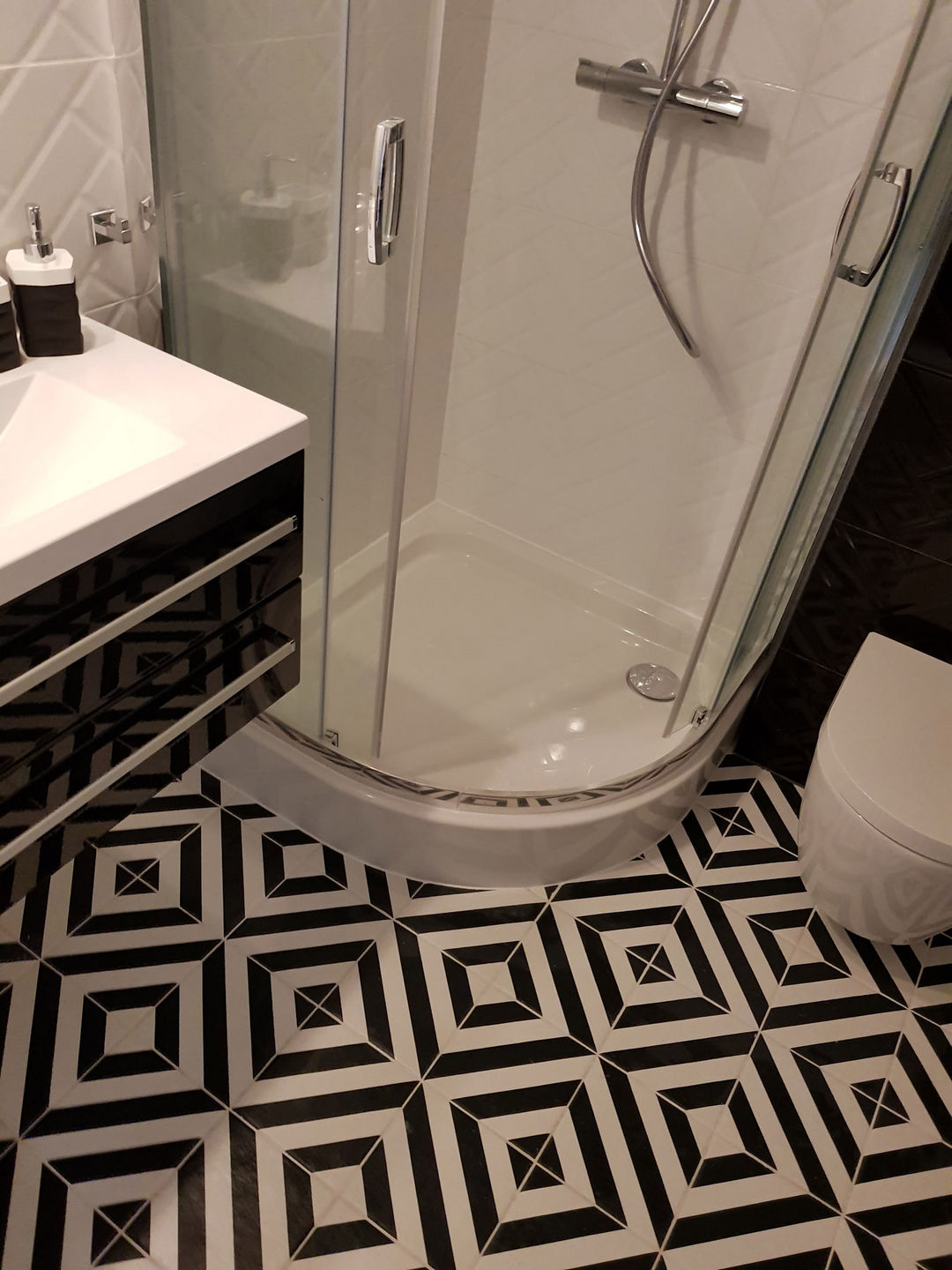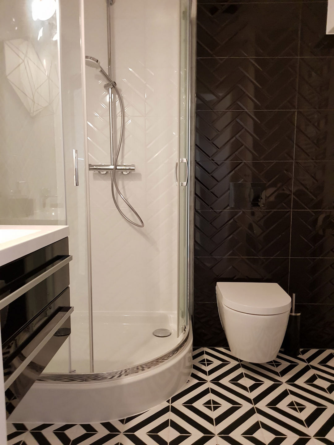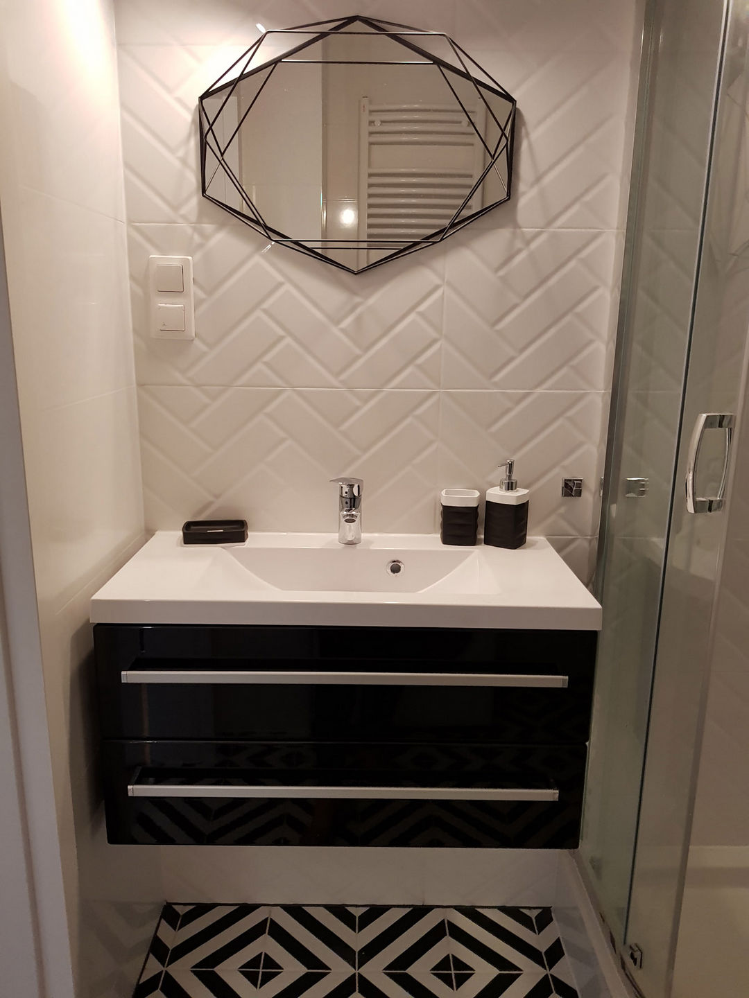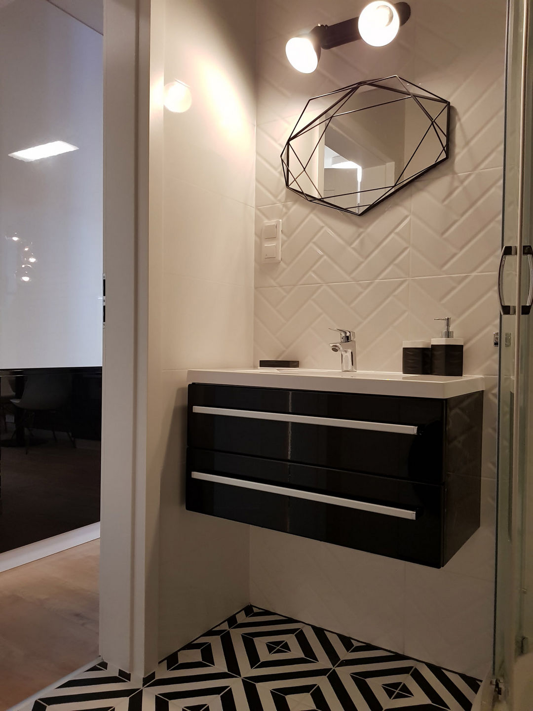 Całość została utrzymana w nowoczesnej stylistyce, gdzie dominuje czerń i biel oraz ciepło drewna.