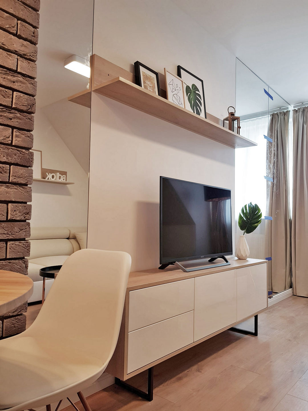 Ta kawalerka to było bardzo duże wyzwanie. Mieści się na ostatniej kondygnacji nowej plomby w najbliższej okolicy Rynku wrocławskiego. Jej rzut to wydłużona litera L, a w najszerszym miejscu ma 280 cm. Niemniej jednak stanęłam na wysokości zadania i zaprojektowałam układ funkcjonalny, który oprócz łazienki zawiera salon z bardzo dużą, rozkładaną sofą, strefą TV, kącikiem do jedzenia, dużym aneksem kuchennym oraz liczną zabudową meblową przechodzącą od kuchni do przedpokoju, kryjąca szafy. Strefa wejściowa została powiększona optycznie lustrem umieszczonym w oryginalnej wnęce. Jest tu miejsce na odłożenie drobiazgów, butów, oraz odwieszenie okryć wierzchnich. Podobny zabieg z lustrem zastosowałam w pobliżu jedynego okna wychodzącego "na świat", skąd widać wieżę Kościoła Garnizonowego. Dzięki lustru światło dzienne wpadające do mieszkania jest zdwojone.