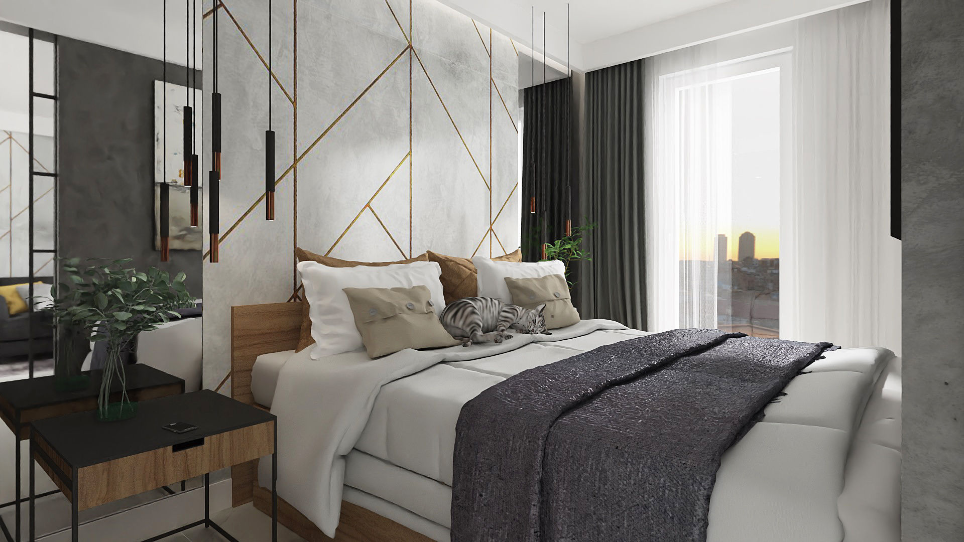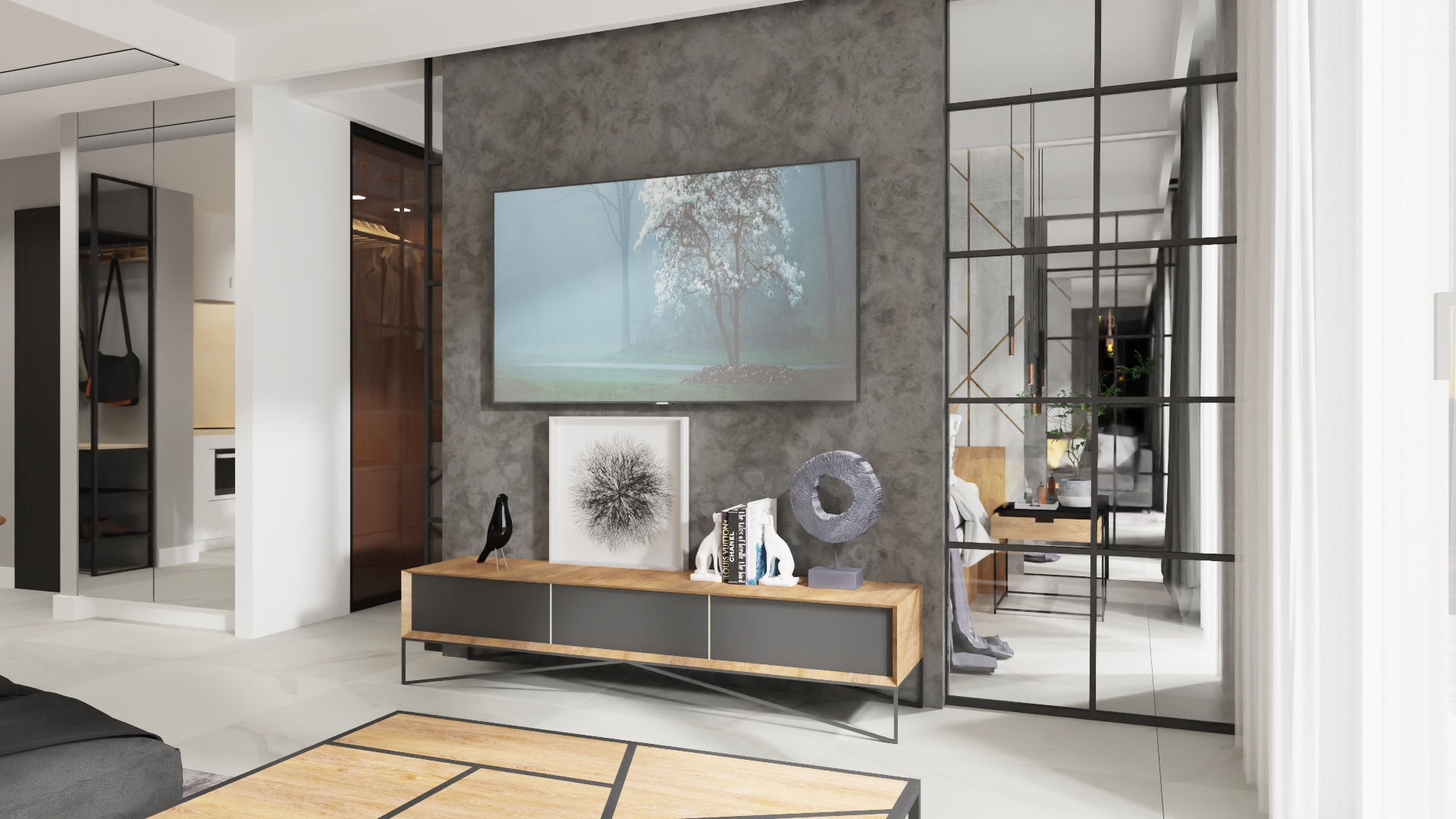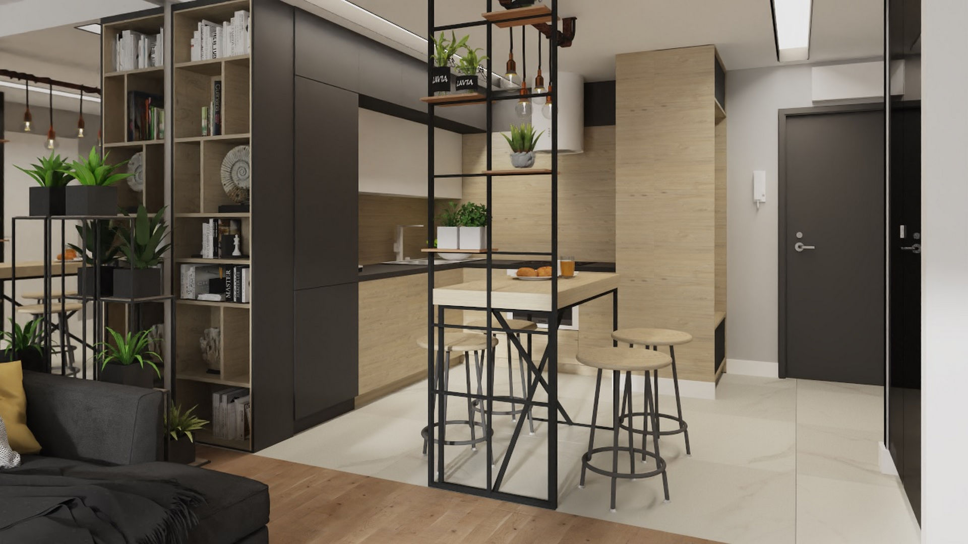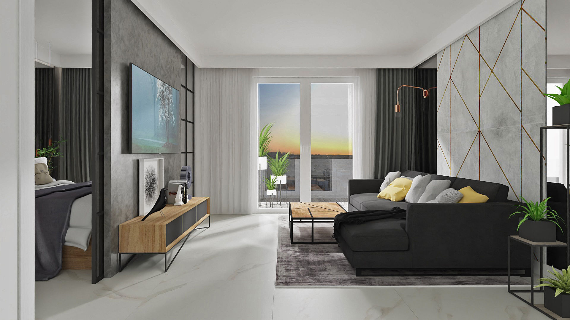 W tym mieszkaniu całkiem odmiennie podeszłam do układu funkcjonalnego i zamiast wydzielania małej sypialni tradycyjnymi ścianami postawiłam na przeszklone, przesuwne drzwi po obu stronach ścianki oddzielającej sypialnię od salonu. Takie rozwiązanie wykorzystałam także później w innych moich projektach. Dzięki temu można było wstawić duże łóżko, a przestrzeń, którą musielibyśmy przeznaczyć na komunikację wokół łóżka została włączona do części dziennej. Dzięki przesuwnym drzwiom ta przestrzeń dodatkowo się powiększa. Kuchnię od salonu oddziela optycznie loftowy barek ze stalową konstrukcją z półkami.