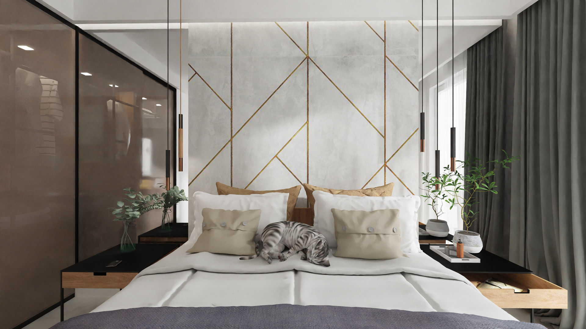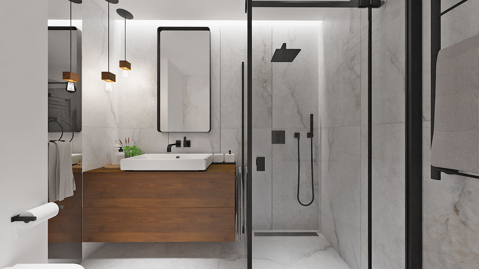 Dzięki nowemu układowi ścian wygospodarowałam także dużą szafę, w części przeznaczoną na środki czystości, odkurzacz, mop itp. Natomiast duże szafy ubraniowe znajdują się w sypialni i zostały wyposażone w przeszklone, przesuwne drzwi. W łazience zastosowałam prosty, minimalistyczny układ z pięknymi płytkami wielkoformatowymi.