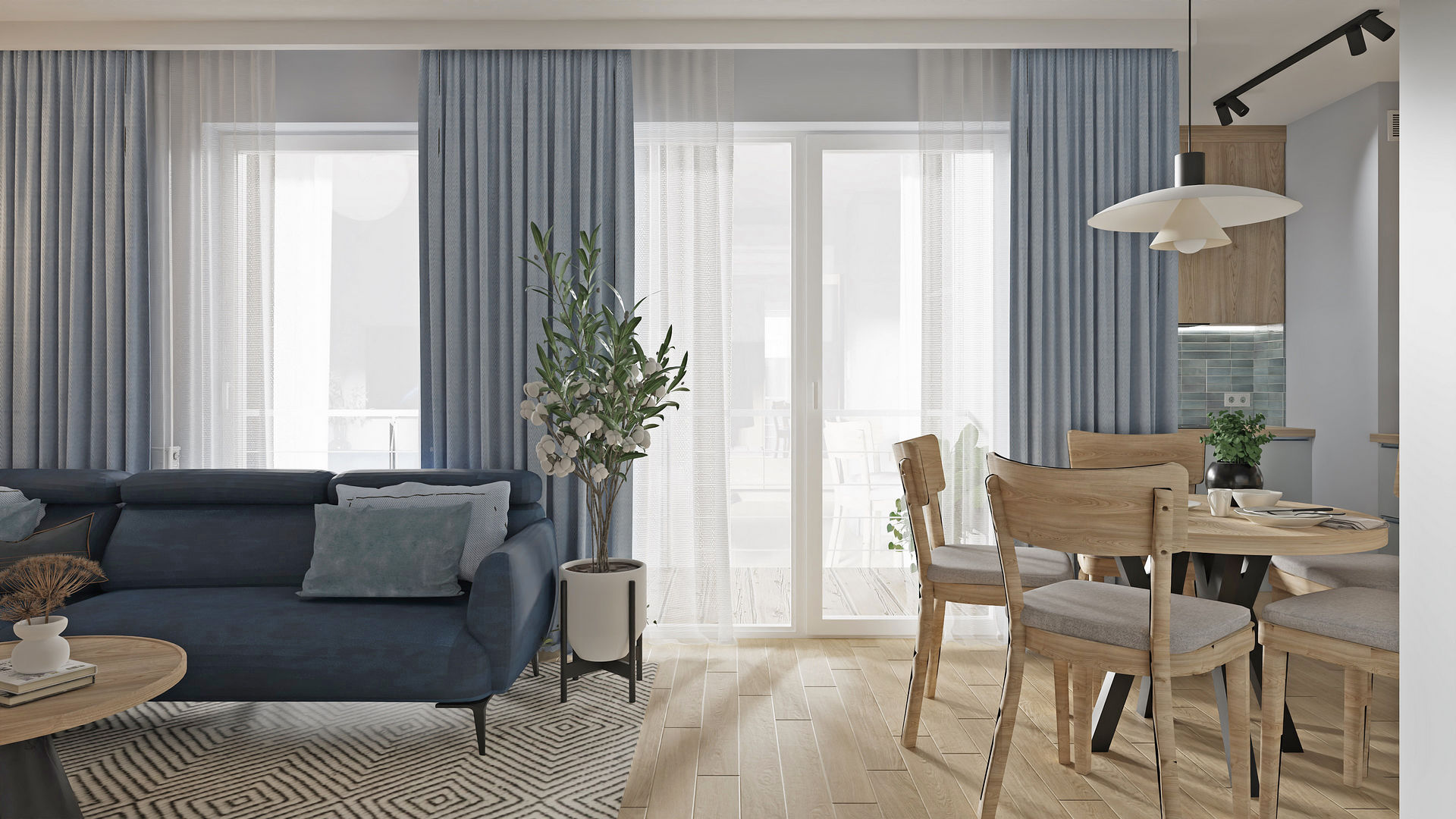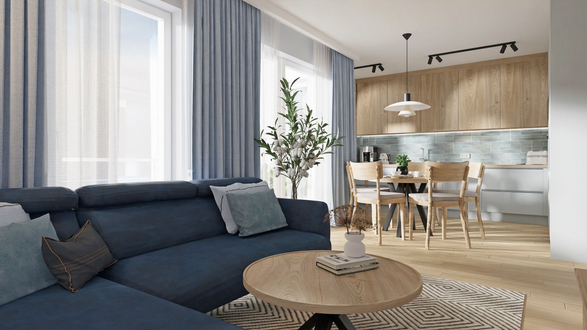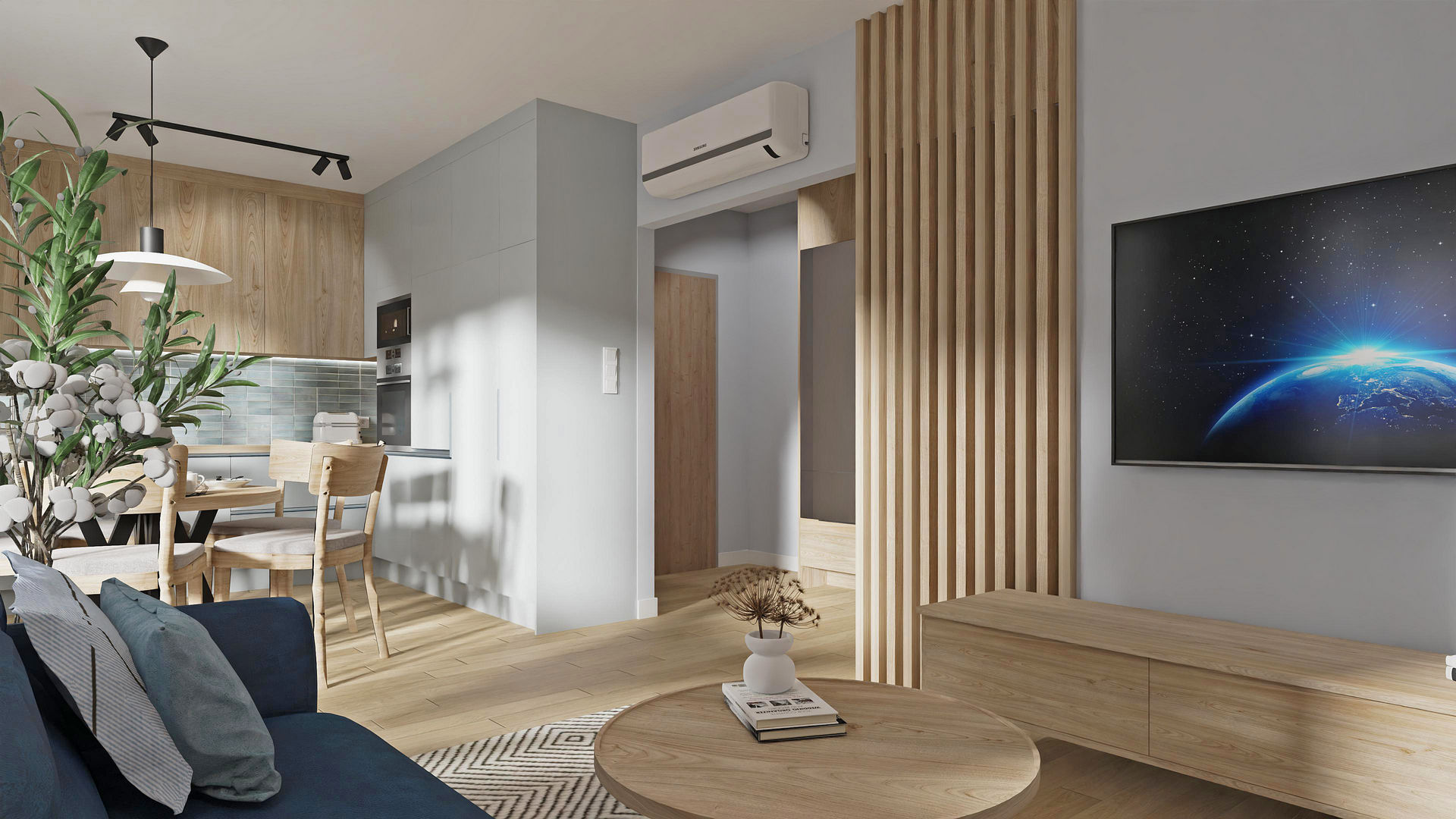Pierwsze własne mieszkanie dla miłej, młodej dziewczyny, które zostało przeze mnie przeprojektowane funkcjonalnie. Po likwidacji kilku ścian układu pierwotnego udało się wygospdarować bardzo duży salon z jadalnią i ukrytą częściowo kuchnią. Dzięki likwidacji ścian do przedpokoju, również ta strefa zyskała na lekkości i dodatkowym oświetleniu. Jednocześnie ażurowe lamele osłaniają nieco dalszą część mieszkania z sypialnią, łazienką i garderobą. W mieszkaniu na całości zaproponowałam panele winylowe, aby nie musieć oddzielać kuchni od salonu inną posadzką. Takie rozwiązanie sprawia, że mieszkanie wydaje się większe. Jeden z ulubionych kolorów właścicielki to niebieski i granat, więc grają one główną rolę, a jasne, niezbyt żółty odcień drewnianych mebli i paneli doskonale z nimi współgra.