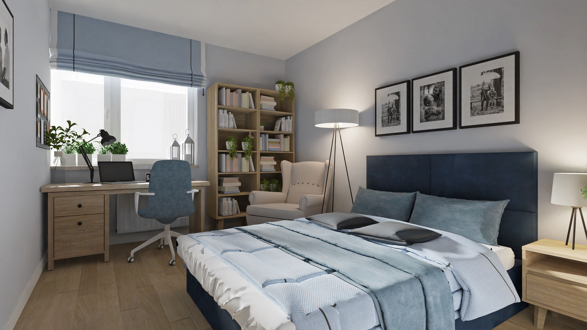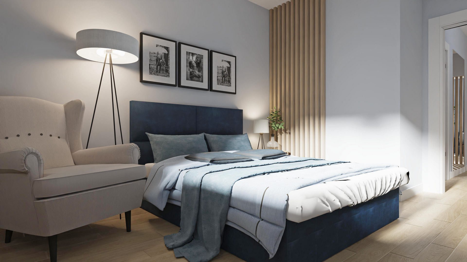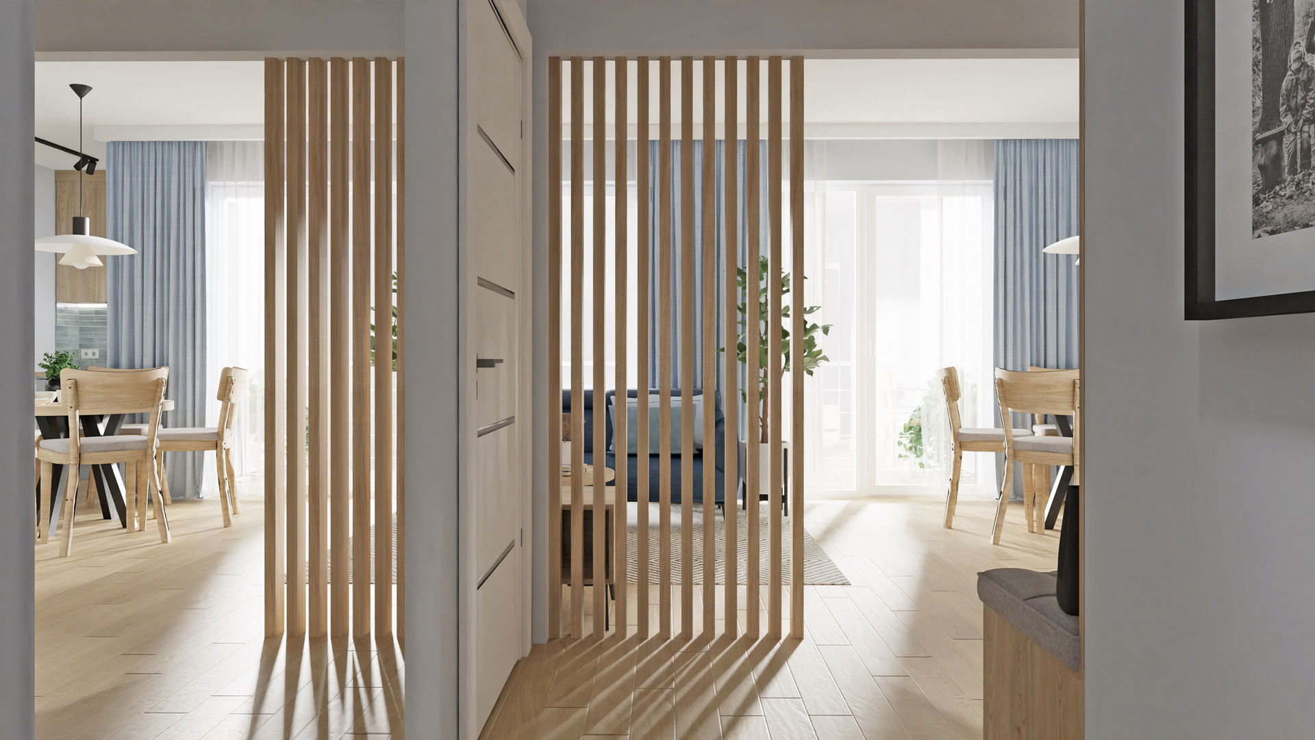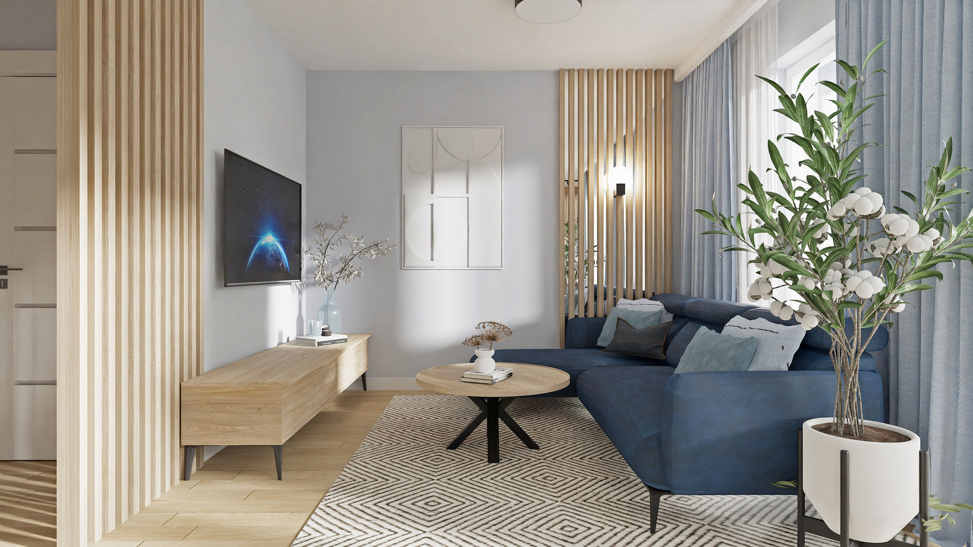 Pierwsze własne mieszkanie dla miłej, młodej dziewczyny, które zostało przeze mnie przeprojektowane funkcjonalnie. Po likwidacji kilku ścian układu pierwotnego udało się wygospdarować bardzo duży salon z jadalnią i ukrytą częściowo kuchnią. Dzięki likwidacji ścian do przedpokoju, również ta strefa zyskała na lekkości i dodatkowym oświetleniu. Jednocześnie ażurowe lamele osłaniają nieco dalszą część mieszkania z sypialnią, łazienką i garderobą. W mieszkaniu na całości zaproponowałam panele winylowe, aby nie musieć oddzielać kuchni od salonu inną posadzką. Takie rozwiązanie sprawia, że mieszkanie wydaje się większe. Jeden z ulubionych kolorów właścicielki to niebieski i granat, więc grają one główną rolę, a jasne, niezbyt żółty odcień drewnianych mebli i paneli doskonale z nimi współgra.