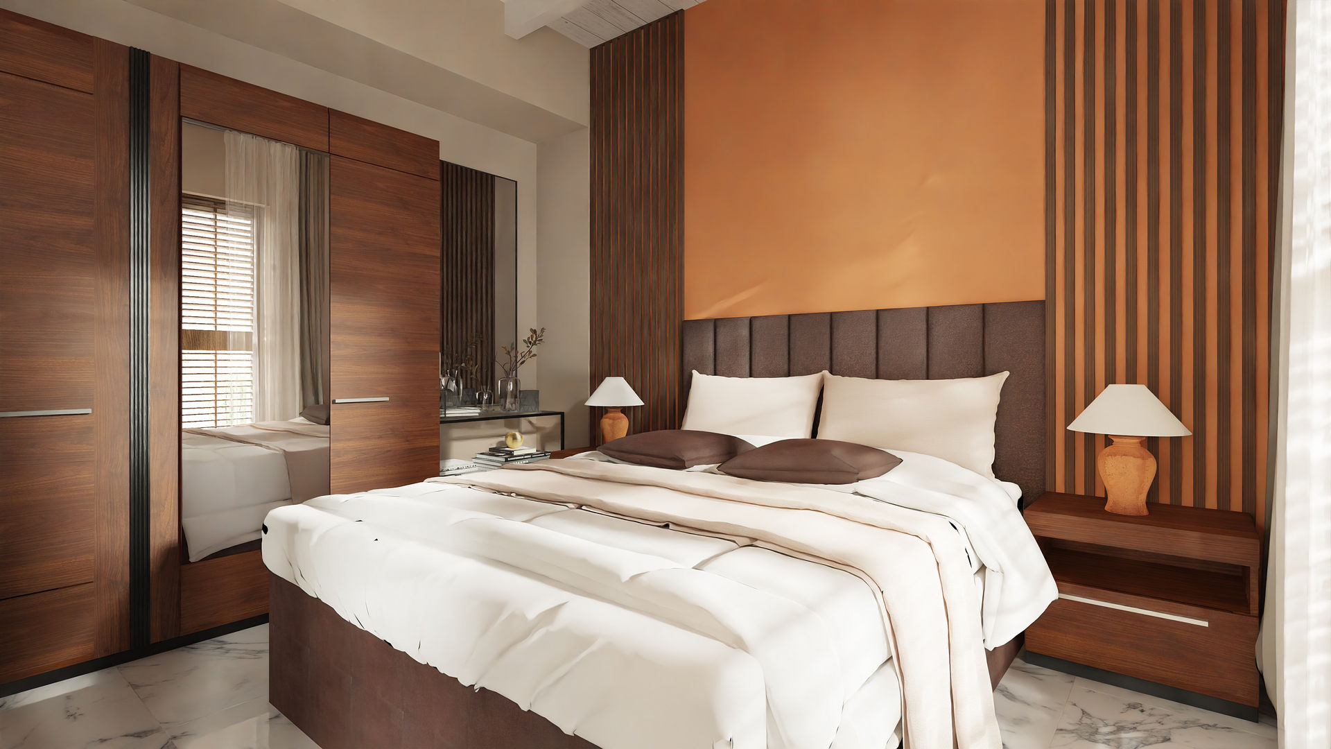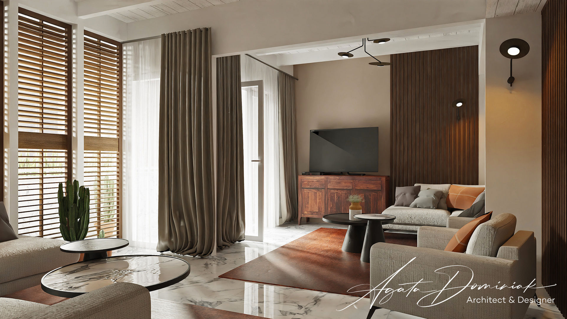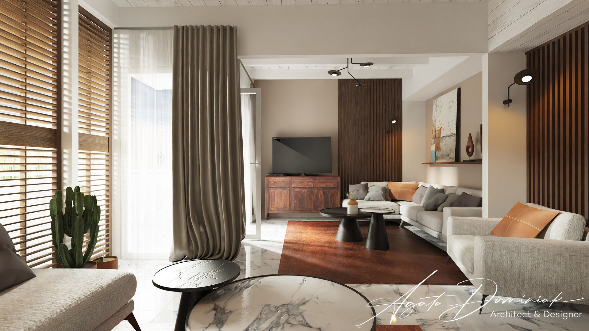 Mieszkanie wakacyjne_salon z jasną sofą i marmurową posadzką